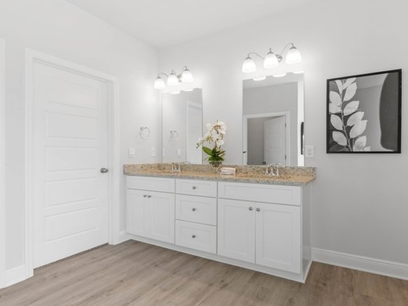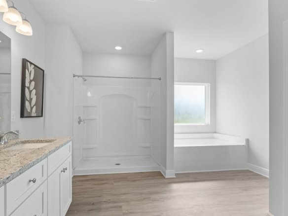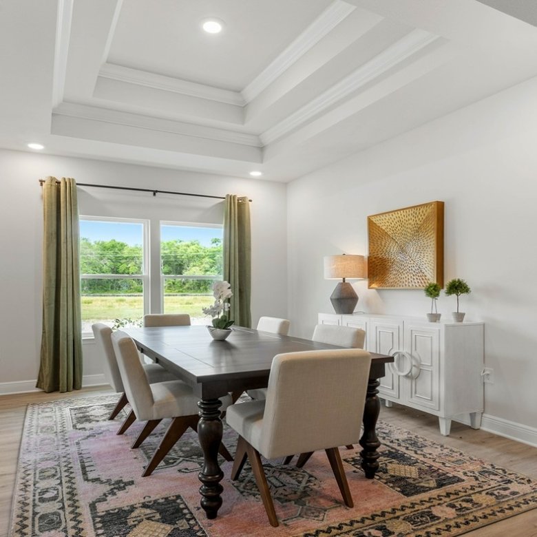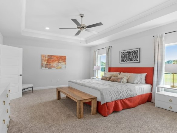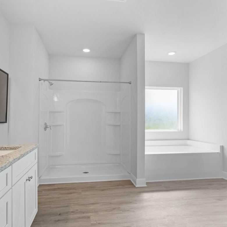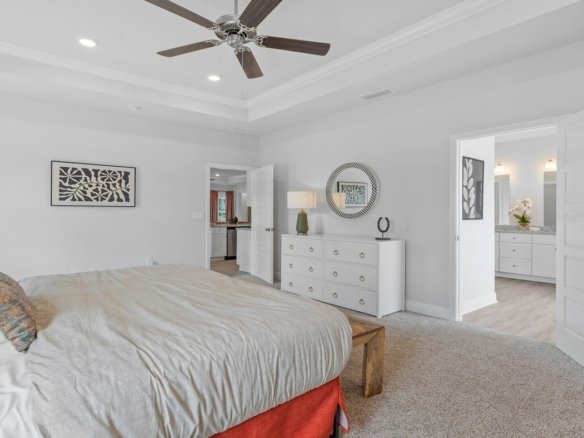 In the back of the home, the primary suite is a private retreat. The large bedroom features trey ceilings and natural light, creating an inviting space. The en suite features dual vanities, garden tub, separate walk-in shower and spacious closet.