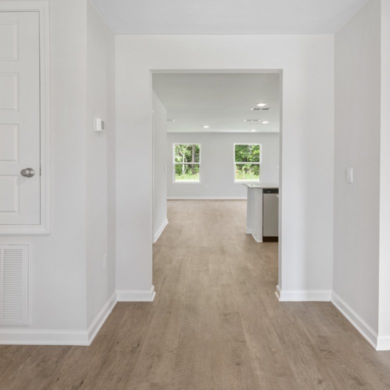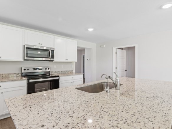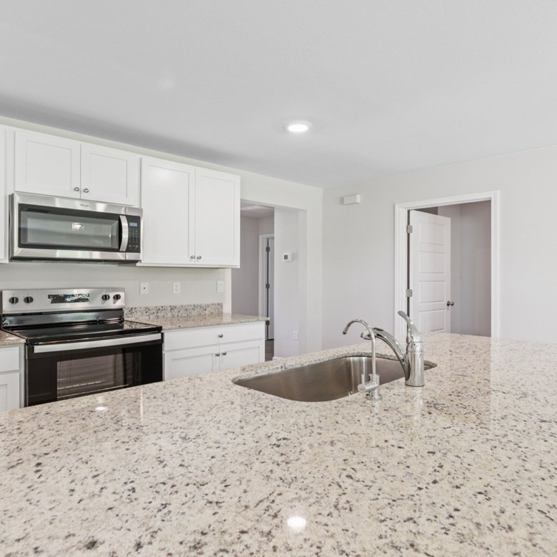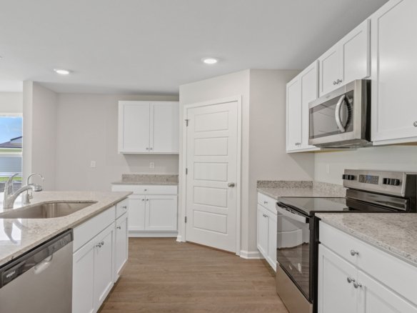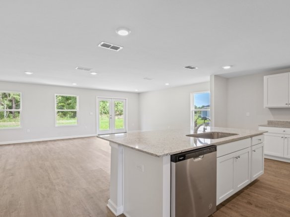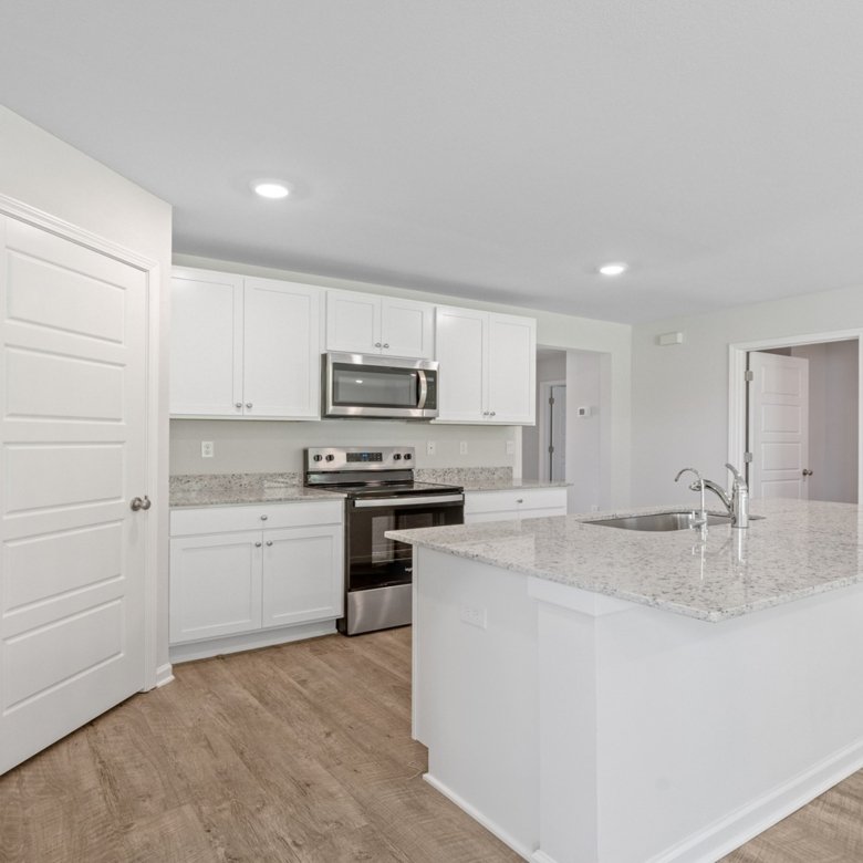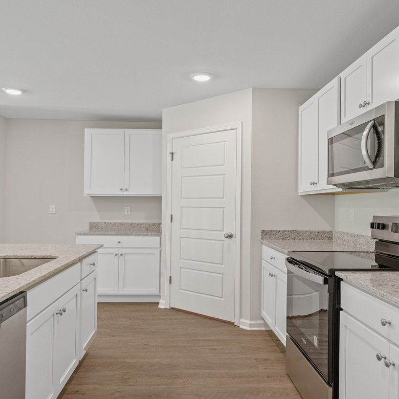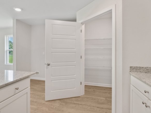 Down the hall, you enter into the inviting, open living space. The kitchen is the heart of the home with a large center island. The kitchen is a great space with shaker-style cabinetry, plenty of granite counter space and a large corner pantry. The great room is bright and welcoming with recessed lighting and many windows. The living area is perfect for daily life and entertaining. The laundry room is conveniently located in the middle of the home and has extra shelving for storage.